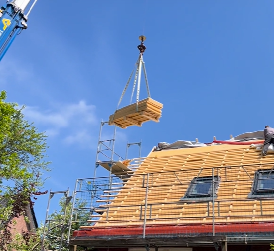 Neuer Dachaufbau mit förderfähiger Dämmung, neue Pfannen in anthrazit mit dachintegrierten Photovoltaik-Modulen.